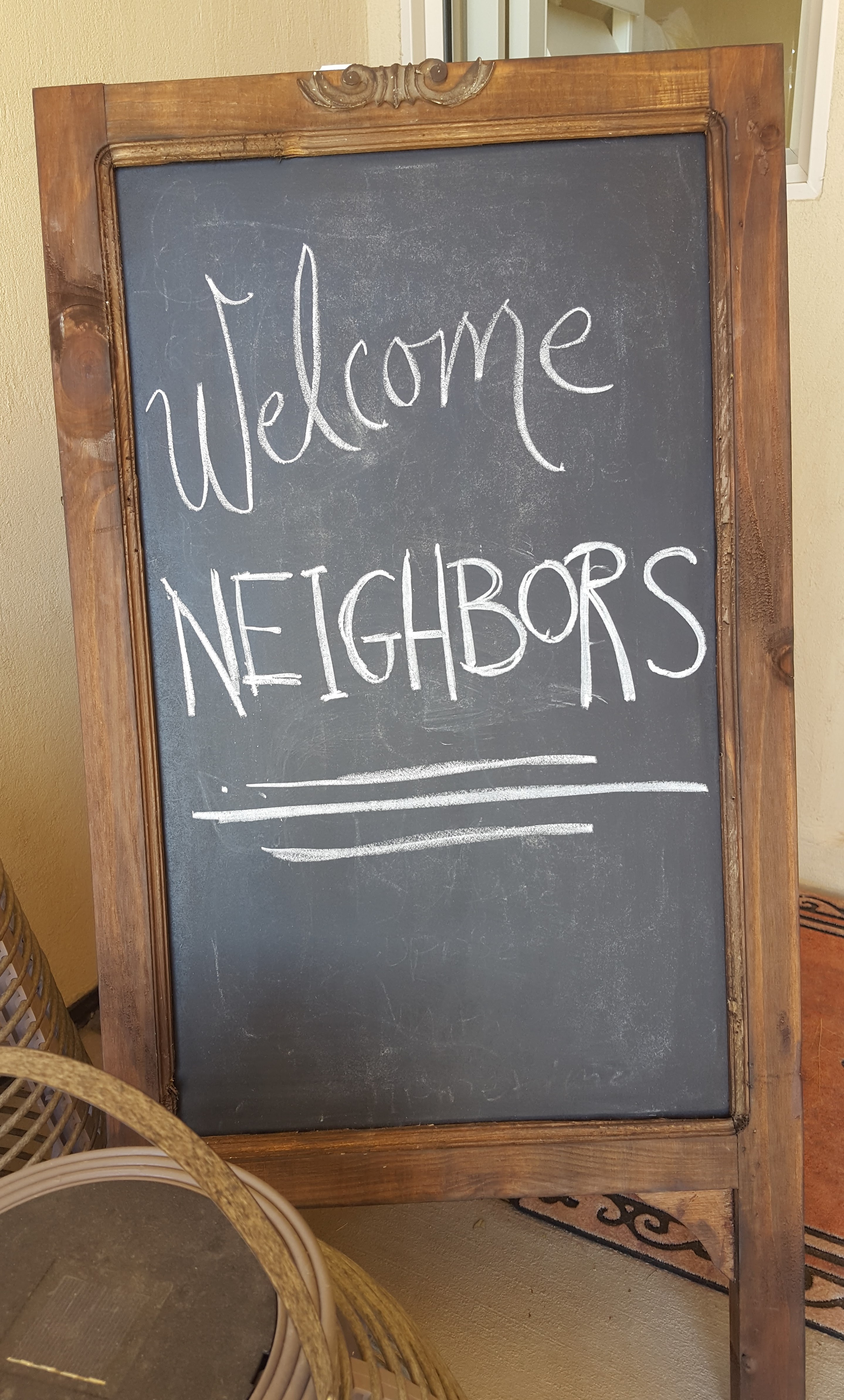 Welcome Neighbors On March 7, 2018May 31, 2018 By Kathryn Featherstone Chalk board sign stating “Welcome Neighbors” for neighborhood party.