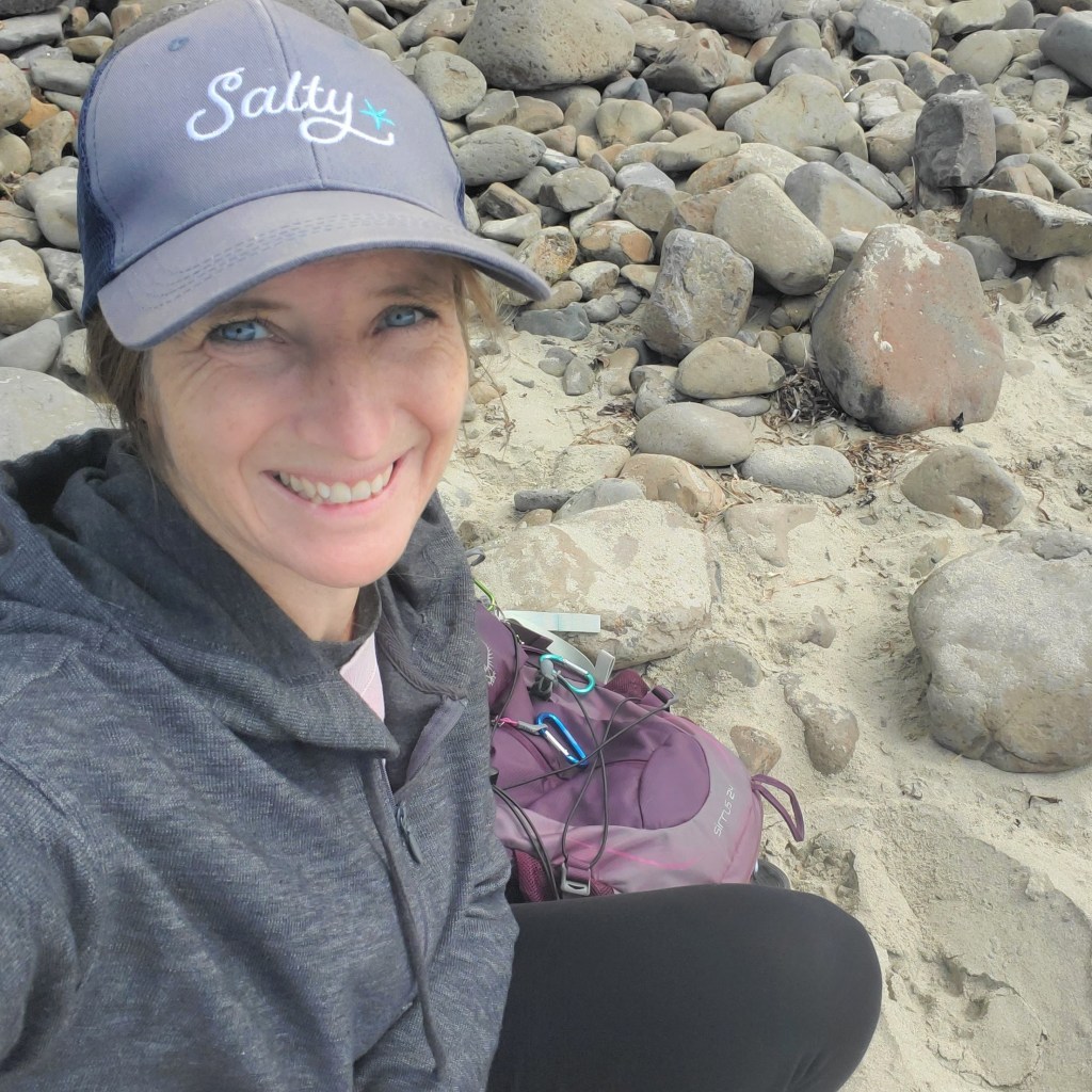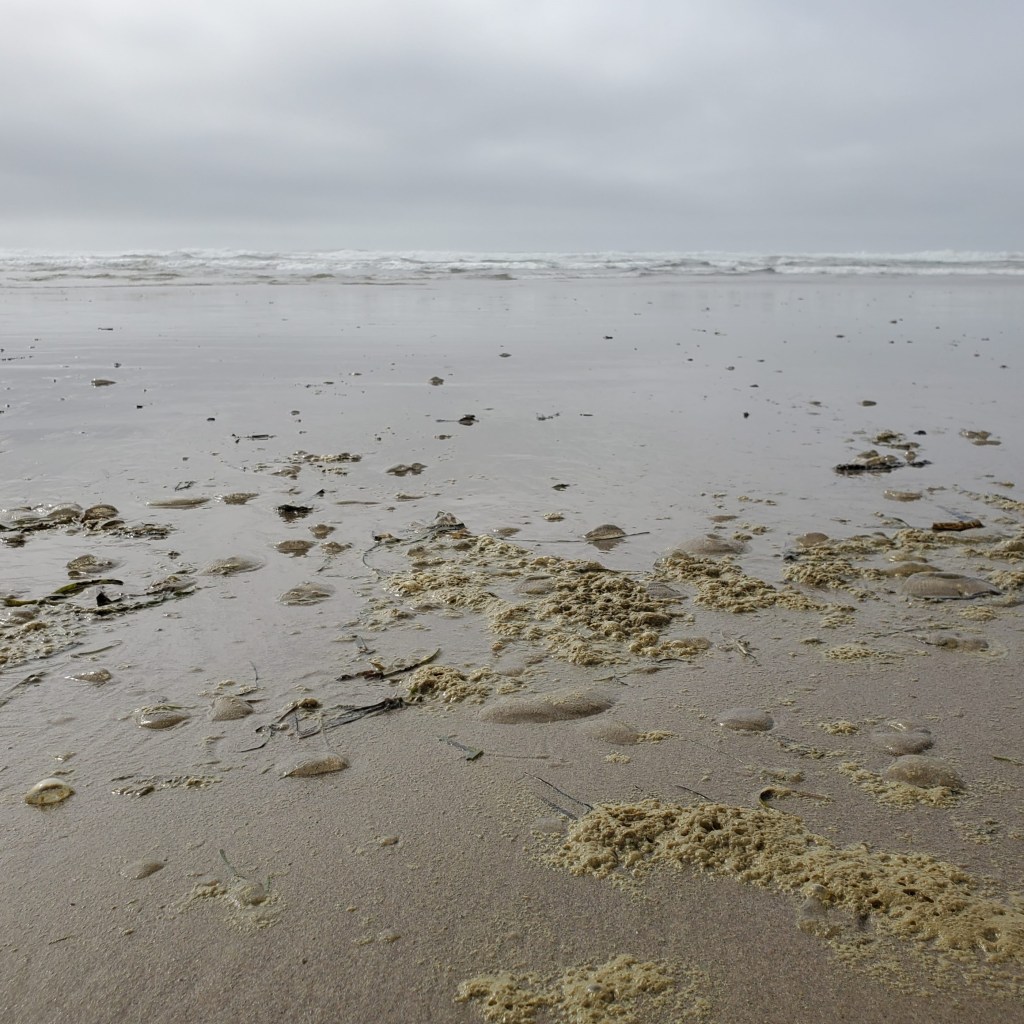 This time it’s overcast and there are brownish-green bubbles in the water, and left behind where the waves wash. Green lines are left where each wave has been. And the shore is strewn with jellyfish – thousands of pieces and many whole – instead of sand dollars. If you step on these wrong, you can get stung!